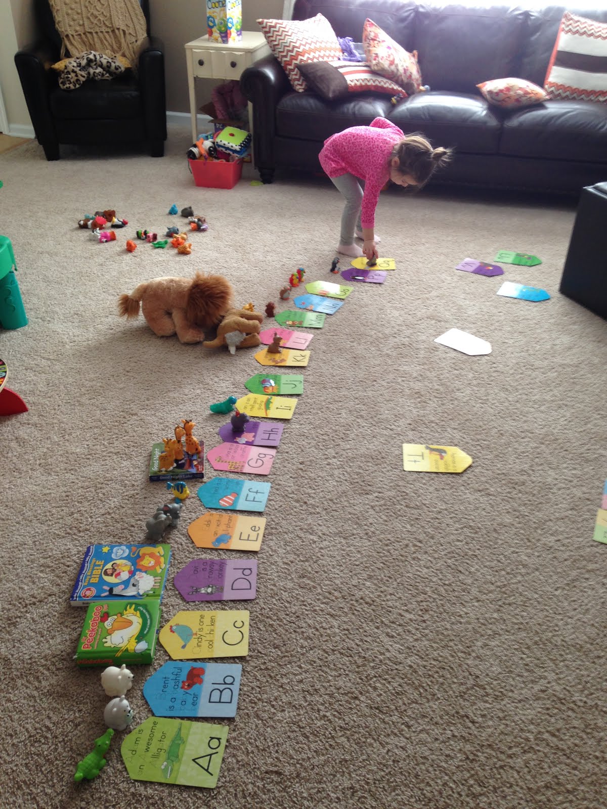 Another teacher fail -- I had her matching up the animal on the card with something in the house -- and I didn't plan to well ahead. Some items we majorly had to fudge on. oops!